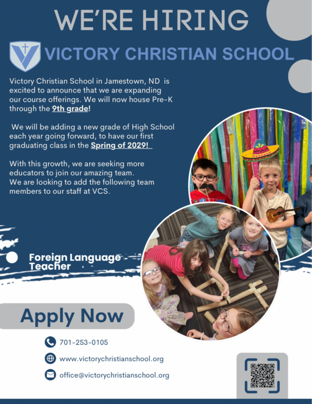 Victory Christian School is located in Jamestown, North Dakota. VCS is a private Christian elementary school and middle school offering pre-kindergarten through 9th grade education. VCS also operates a childcare facility.